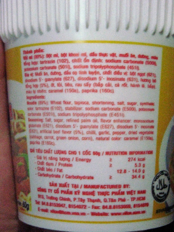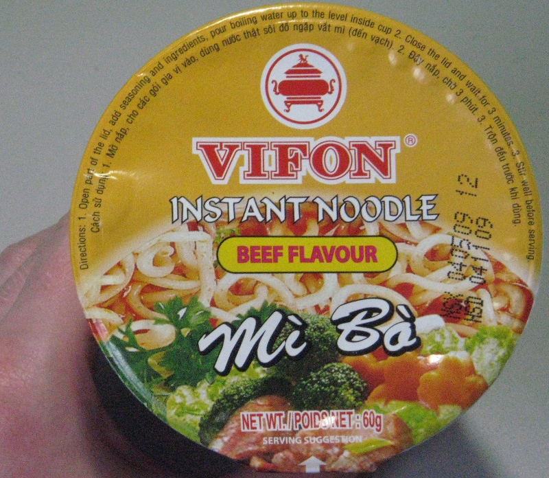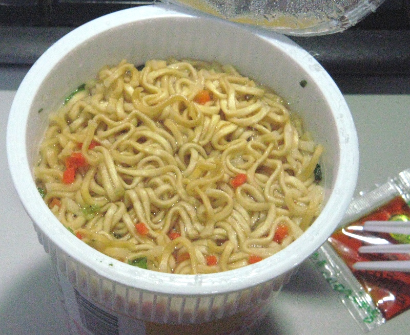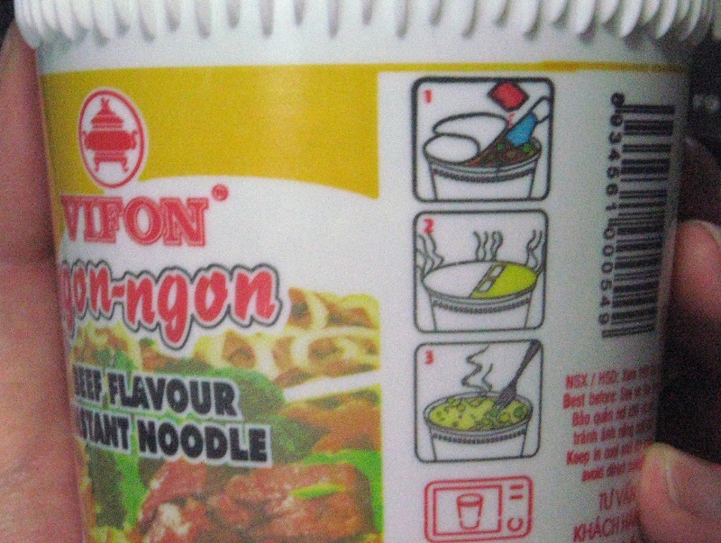 説明は“ビーフフレーバー”だということ以外全然解りませんでしたが、かろうじて“Wait 3 minutes.”と書いてあったのと、図説してあったので、お湯を入れて3分待ってみたら、何となく出来上がったようでした。